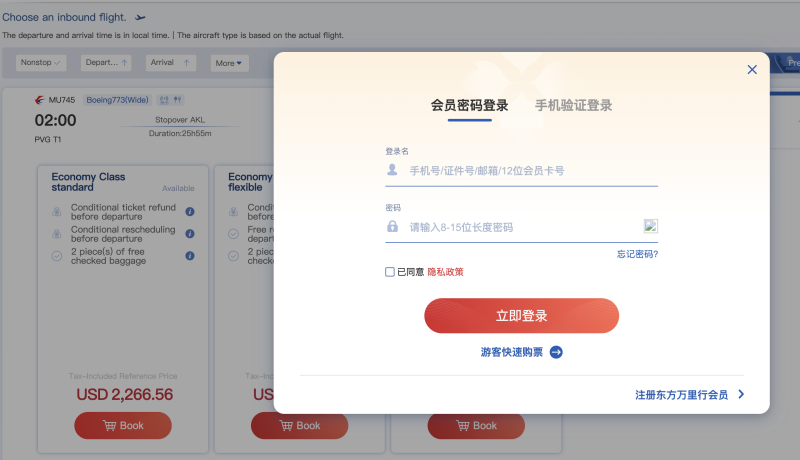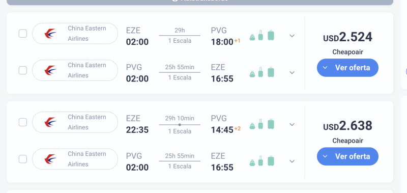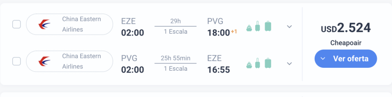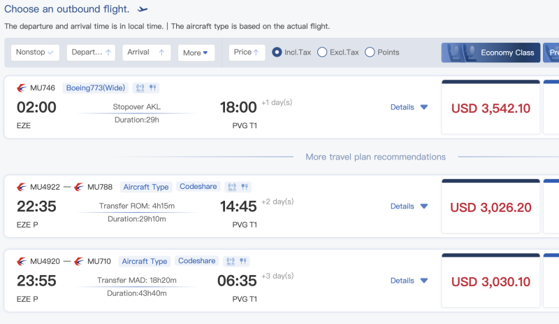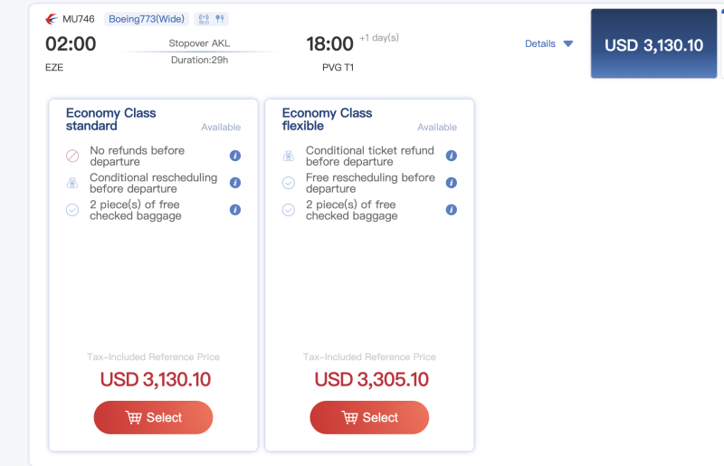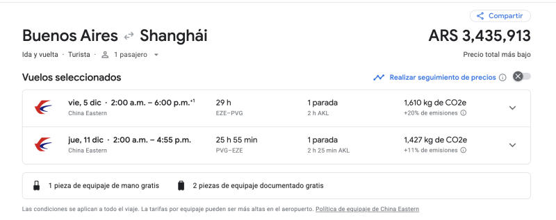 Hoy se pueden ver los precios de los vuelos que saldrán a Shanghai desde la Argentina por China Eastern en su web y en los metabuscadores, pero probando con el mismo sistema no se ven aun lo de la escala que tendrá en Auckland, Nueva Zelanda.