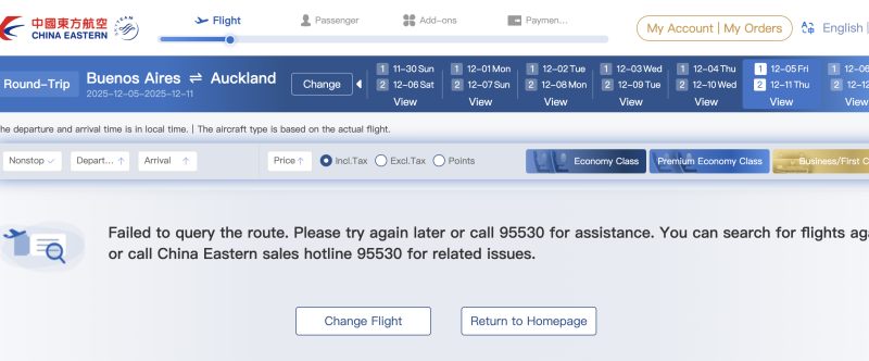 Haciendo lo mismo pero eligiendo DIRECTO a Auckland… no tiran resultados, ni los metabuscadores ni China Eastern que pide llamar (??)