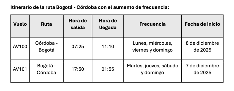 Córdoba, 14 de octubre de 2025 – En línea con su compromiso de brindar más acceso y conectividad a millones de pasajeros en América Latina, Avianca anunció el incremento de frecuencias de sus vuelos directos entre Córdoba y Bogotá, pasando de tres frecuencias semanales a un vuelo diario a partir del 7 de diciembre. Así, la compañía conectará aún más al interior de Argentina con más de 80 destinos en Colombia, América Latina y Europa.
