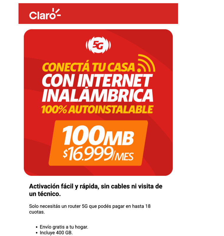 VÁLIDO EN ARGENTINA DEL 20/10/2025 AL 30/11/2025 PARA CLIENTES MASIVOS. ACCEDÉ A UN PLAN DE 400GB DE INTERNET HASTA 100 MB DE DESCARGA POR $16.999 POR MES. PRECIO SIN IMPUESTOS $14.049 POR MES. DEBERÁS ADQUIRIR UN ROUTER POR $165.600. PRECIO SIN IMPUESTOS $149.865. CONSULTÁ FINANCIACIÓN EN TIENDA.CLARO.COM.AR – “MEDIOS DE PAGO”. STOCK: 1.000 U. SUJETO A FACTIBILIDAD TÉCNICA Y COBERTURA. MÁS INFO EN CLARO.COM.AR. AMX ARGENTINA SA. CUIT: 30-66328849-7. AV DE MAYO 878, CABA.
