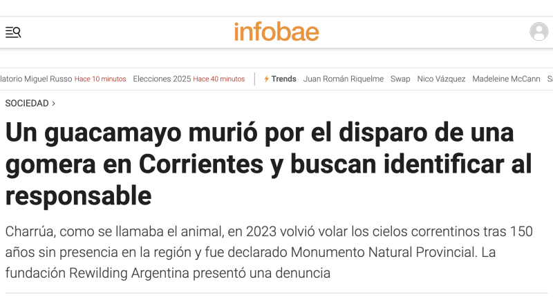 Seguramente Rewilding pasó la noticia, lo bien que hizo. Porque en Infoabe pusieron lo que pasó, fotos del pobre guacamayo que no quiero poner acá, pero que en la nota están https://www.infobae.com/sociedad/2025/10/07/un-guacamayo-murio-por-el-disparo-de-una-gomera-en-corrientes-y-buscan-identificar-al-responsable/