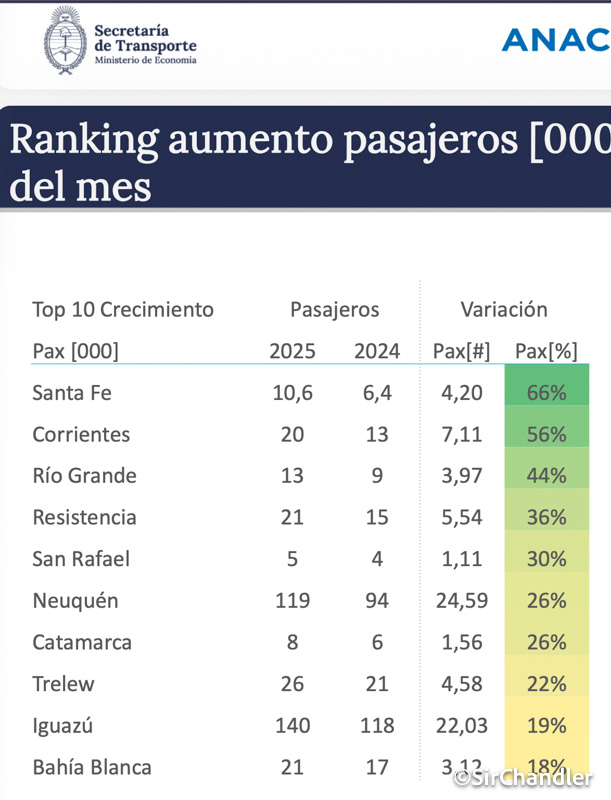 Y arranco con el cuadro de aumento en determinados aeropuertos por los pasajeros. El primero es forzado, por el cierre de Rosario lo que favoreció a Santa Fe que recibió algunos vuelos de Aerolíneas Argentinas. El segundo lugar para Corrientes es algo más relevante y ni hablar de lo de Neuquén e Iguazú que son los que más pasajeros tuvieron realmente