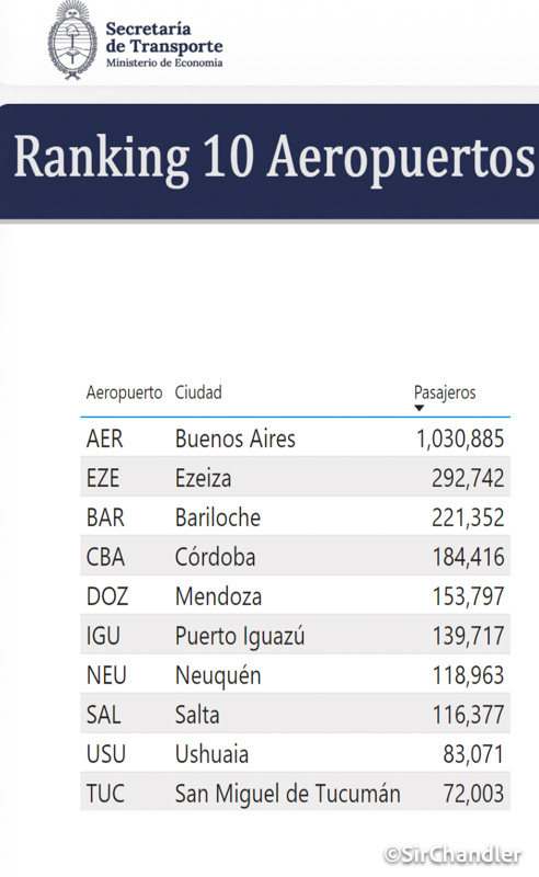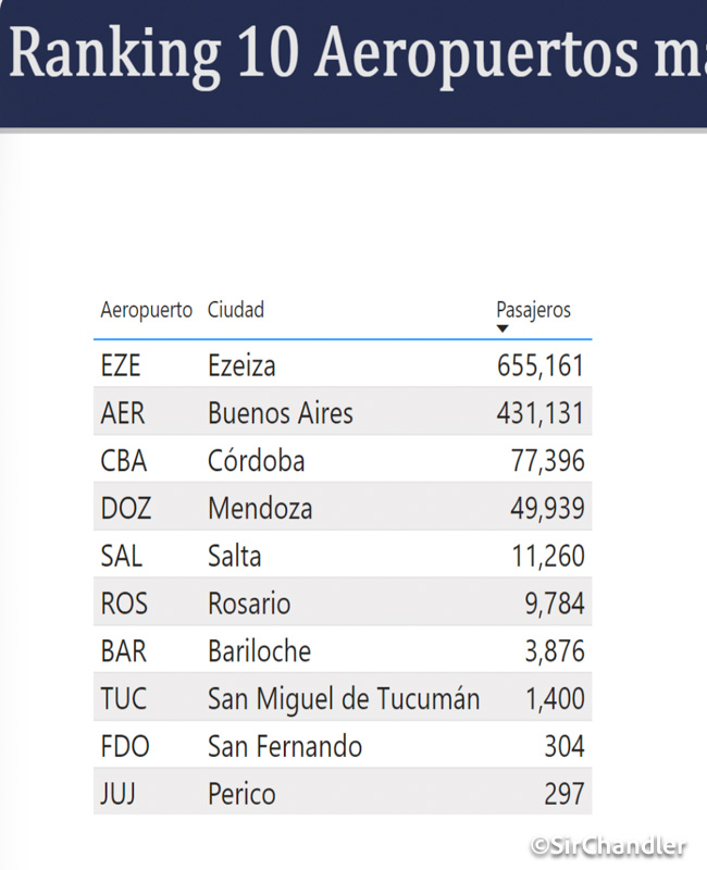 En aeropuertos obviamente Ezeiza el más popular, pero Aeroparque con el poco espacio que tiene está bien cerca. Córdoba el más fuerte de los otros seguido por Mendoza. Quinto lugar para Salta y sexto mentiroso para Rosario, porque no tuvo mes completo de operaciones.