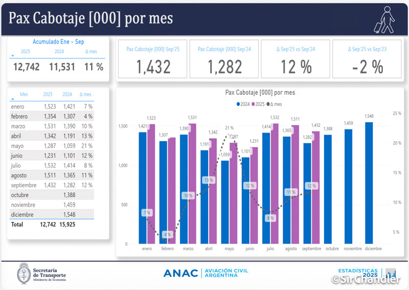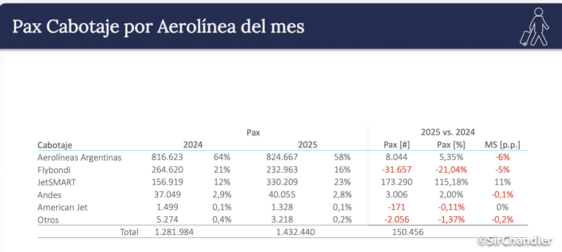 Vamos con el total de cabotaje que fue de 1.432.000 pasajeros, un 12% más que el año pasado pero un 2% por debajo del 2023. Pero si medimos contra 2019, o sea pre pandemia, se logró estar un 5,8% arriba, lo cual es muy bueno