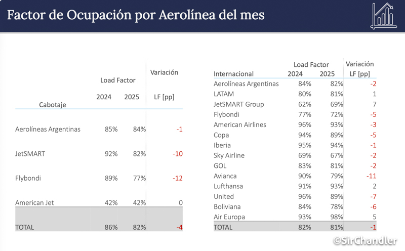 El factor de ocupación ponderado por las constantes cancelaciones de Jetsmart y Flybondi y el casi cumplimiento perfecto de Aerolíneas refleja que Aerolíneas es por lejos la mejor comercializada y la que mejor utiliza los recursos.