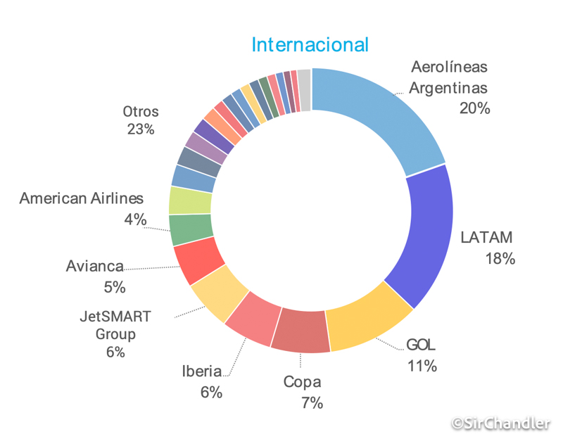 En internacional de todos los destinos, Aerolíneas sigue líder y Latam segunda