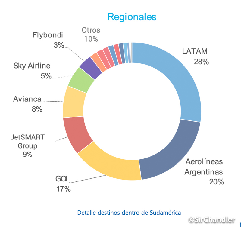 Pero al medir SOLO SUDAMERICA como destino directo, Latam manda y GOL queda cerca de Aerolíneas