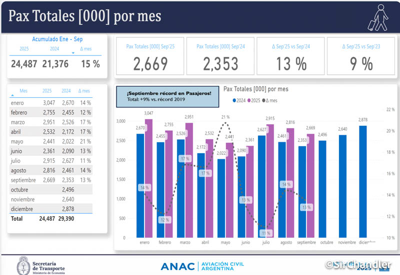 Total total, tuvimos 2,6 millones de pasajeros, un 13% más que el año pasado y 9% por encima de 2023. Contra 2019 es algo parecido, porque quedó 9,6% arriba