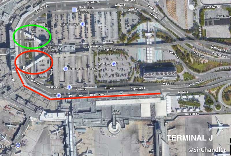Básicamente el pasillo que une la terminal J con el centro de alquiler de autos, más todas las terminales intermedias, tiene cerrado ese pasillo. También el puente que cruza hasta el lugar donde llega el tren. Por eso acá en rojo todo lo cerrado y en verde el que si está habilitado de los puentes. Básicamente quien llegue o se vaya con American Airlines POR AHORA no se entera de esto