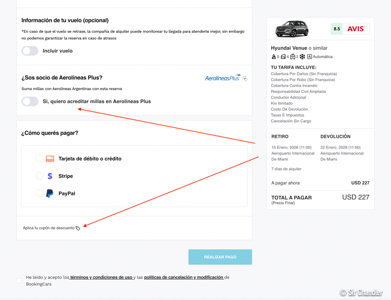 Tan solo quiero aclarar que hay un error en este post. Alquilé un auto para ir el Black Friday a Miami. Mi mujer estuvo averiguando con su agente de viajes, y los precios eran iguales a los de Bookingcars.com, pero…. Con los seguros básicos. Si tenemos en cuenta que en Bookingcars están todos los seguros, y además te hace descuento con el código sirchandler, ahí si hice diferencia de precio, y me tiré de cabeza. Asi que el lunes 13 de octubre cerré el alquiler en BookingCars, y….. Ya me pidió el dato de ARPlus!!!!!