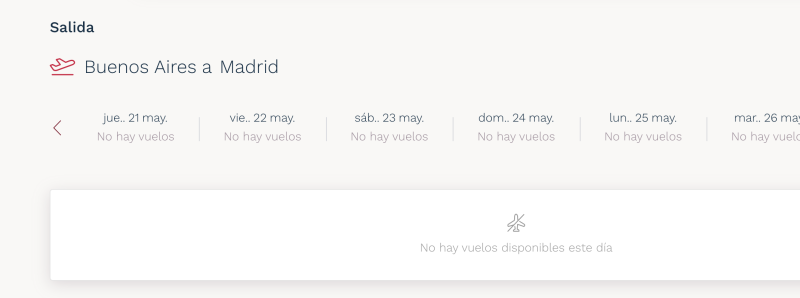 Si nos guiamos por lo que apareció en su buscador, esto arrancaría en mayo, el sábado 24 en el sentido Ezeiza Madrid por lo que sería el día previo bajando. Pero solo pusieron dos vuelos por semana y aparecen hasta mitad de julio