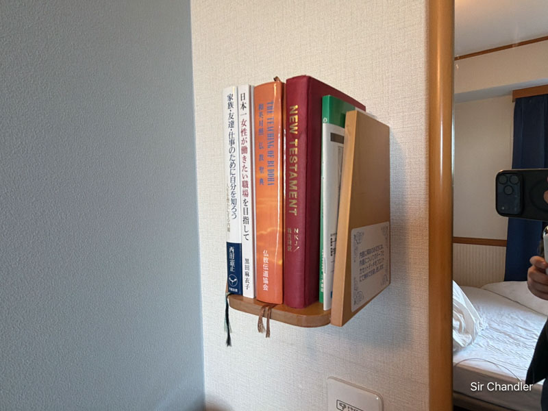 Al no tener mesita de luz, los libros religiosos estaban colgados tanto en japonés como en inglés