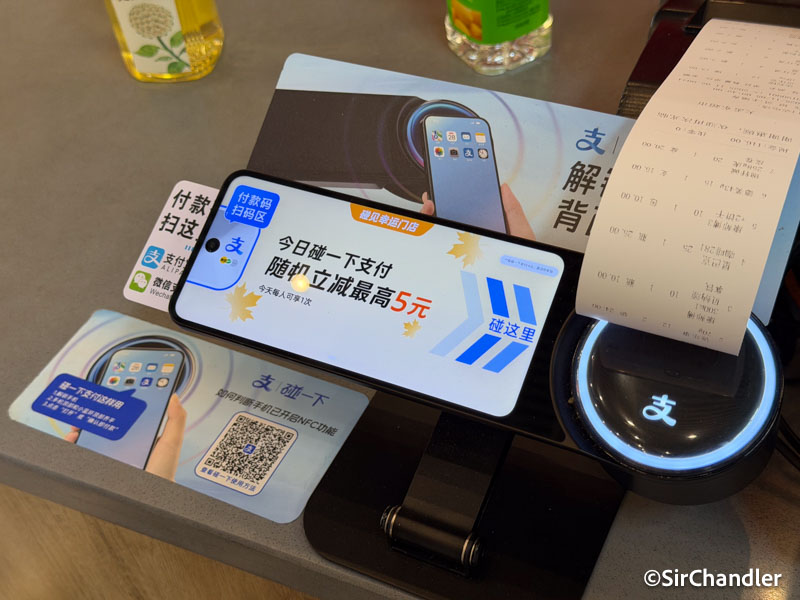 Este era el sistema que tenían y si ven en lo que parece ser un teléfono acostado, hay un lente y con eso lee nuestro QR. También se podría pagar NFC, pero estimo es algo que se podría en los android por ahora, pero siempre vía ALIPAY