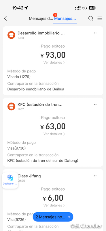 - Me reportaron, y lo vi, que a partir de cierto monto, Alipay pone un recargo en tarjetas extranjeras. Eso me pasó con el gasto que muestro abajo en Starbucks