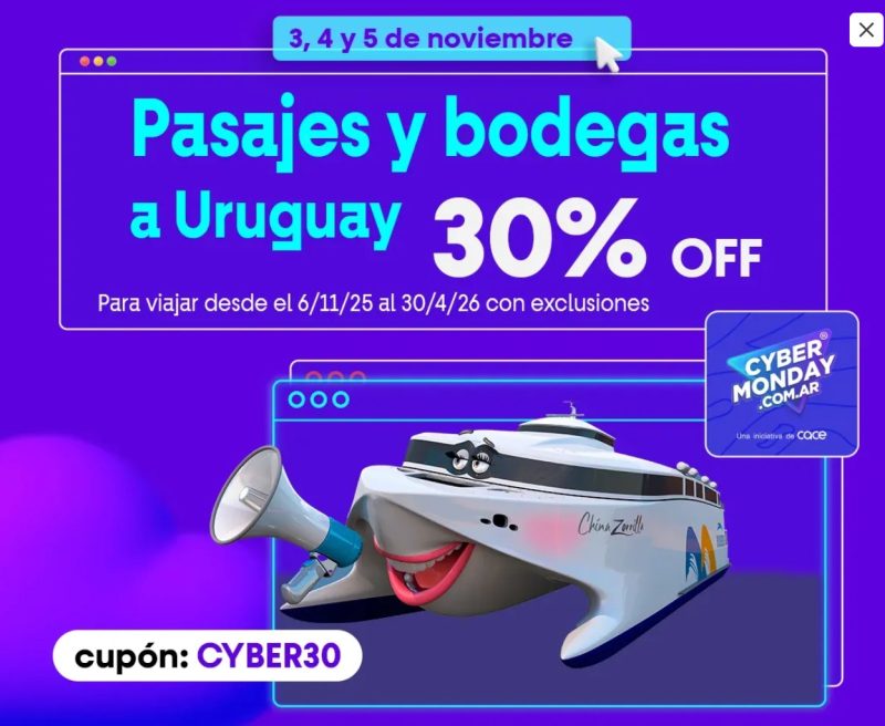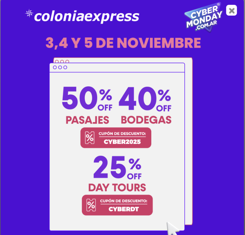 Tanto Buquebus como Colonia Express participan del Cyber Monday y ponen descuentos para la compra de los próximos meses de pasajes a Colonia y Montevideo, directo o con bus, pero también en las bodegas