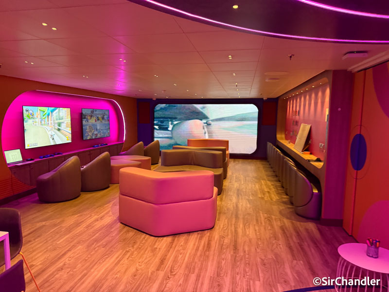 Y he perdido por el paso del tiempo… que mis hijas usen los espacios para los más chicos. Pero pedí permiso para meterme en el de adolescentes cuando no había nadie para ver como era y grabarlo también. Aunque me aclararon que mayormente ese en ese caso, el de adolescentes, era para las pausas, porque tenían muchas actividades a lo largo del barco.
