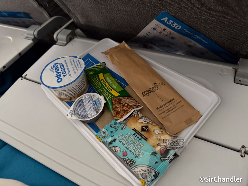 A poco de salir vino el desayuno, galletitas saladas, queso crema Philadelphia, yogurt y barrita de cereal