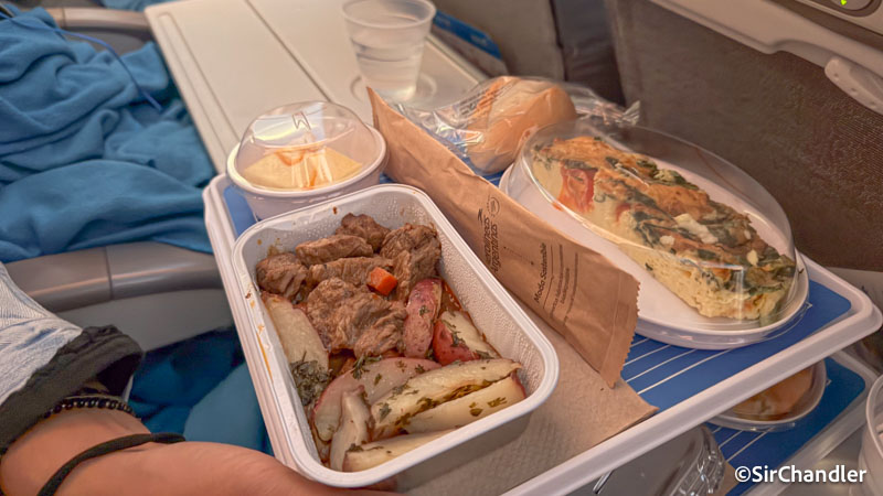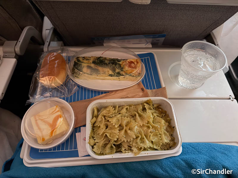 Antes de aterrizar llegó la cena. Yo fui por la pasta… a todos les daban esa fritata (que es muy buena)