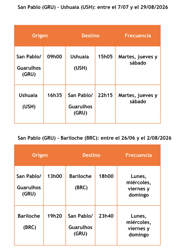 Los vuelos entre San Pablo/Guarulhos y Ushuaia y Bariloche, en la Argentina,