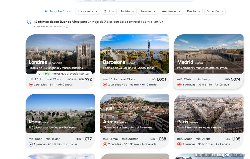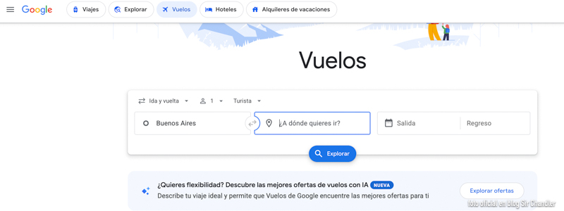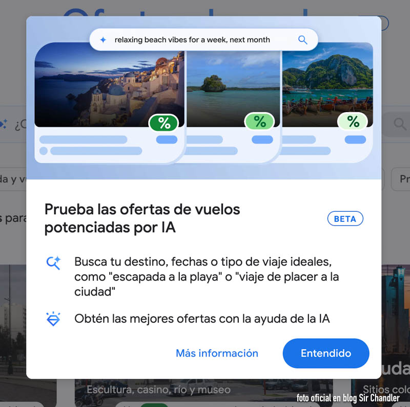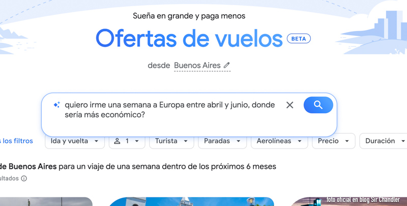 Google anunció que desde hoy se suma un buscador con inteligencia artificial a Google vuelos https://www.google.es/travel/flights donde se puede poner algo más que un origen y un destino como es habitual.