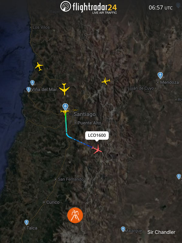 Como se puede ver en el movimiento aéreo, la ruta desde Buenos Aires y otras ciudades suele ser pasando por Mendoza capital y apuntando un poco al norte de Santiago antes de virar hacia el sur.