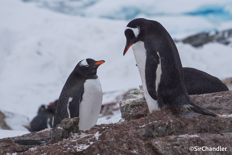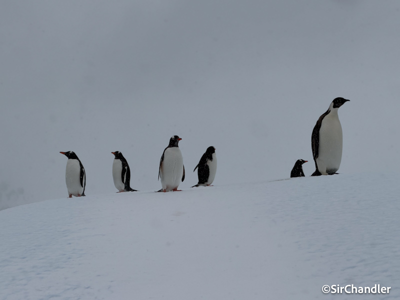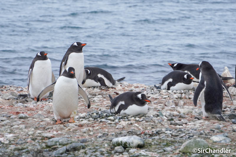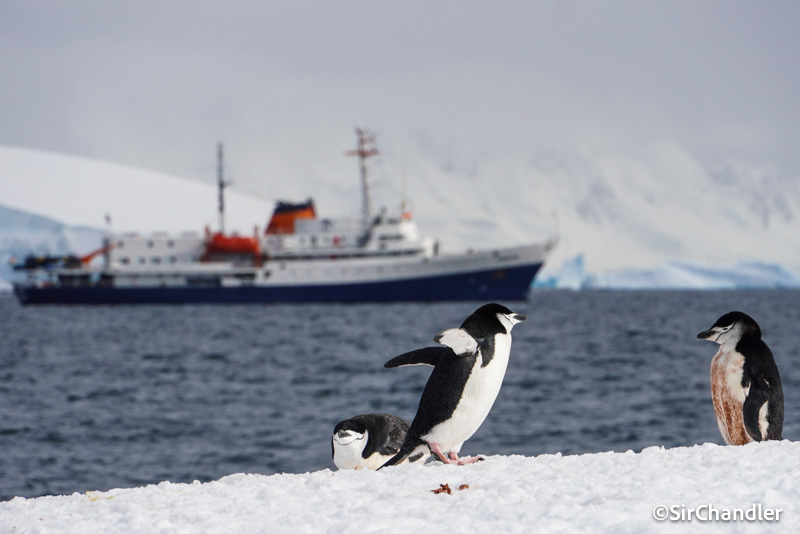 Pingúinos y el MV Ushuaia detrás. No es sangre lo del pecho… son sus cositas