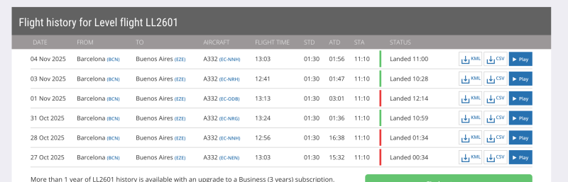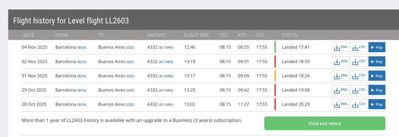 Durante los primeros días de noviembre, algunos vuelos de LEVEL entre Barcelona y Buenos Aires fueron cancelados o reprogramados, y varios pasajeros fueron redirigidos en vuelos de KLM e incluso ITA. Esto sugiere que la aerolínea de bajo costo del grupo IAG enfrentó problemas operativos, posiblemente por la salida temporal de servicio de alguno de sus aviones. Según se pudo observar en sistemas de seguimiento de vuelos, LEVEL operó durante unos días con su propio código (LL) y luego volvió al de Iberia (IB). La situación evidencia la presión sobre su flota y la creciente demanda hacia Argentina.