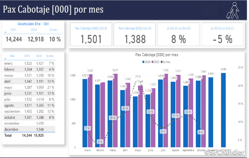 En el segmento de cabotaje, el crecimiento también fue sostenido, con una marcada suba respecto de octubre de 2024, lo que reafirma la expansión continua de la conectividad aérea en la Argentina.