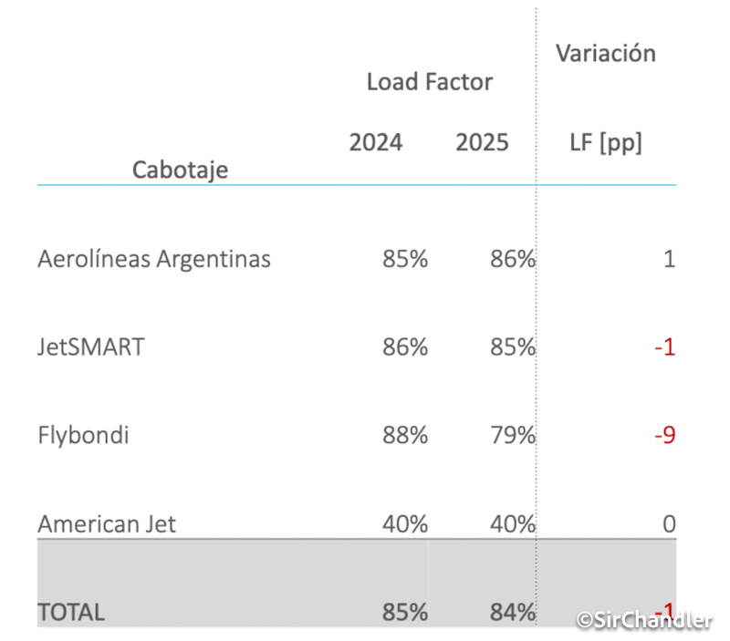 Ocupación de las aerolíneas, Aerolíneas es la que creció un punto. Jetsmart bajó 1 sólo, lo cual es notable porque hay que pensar que desde marzo empezó a meter los A321 y significa que los llenó… porque ahí podría haber tenido una caída por ese aumento de la oferta de asientos y no pasó. Flybondi mostrando por fin una caída de 9 puntos que ojalá sirva para que le den la importancia que se merece a la operación. American Jet es chartera, tiene un solo vuelo regular. Sus aviones pueden ir llenos en un tramo y volver vacíos… entonces así da ese % lógicamente