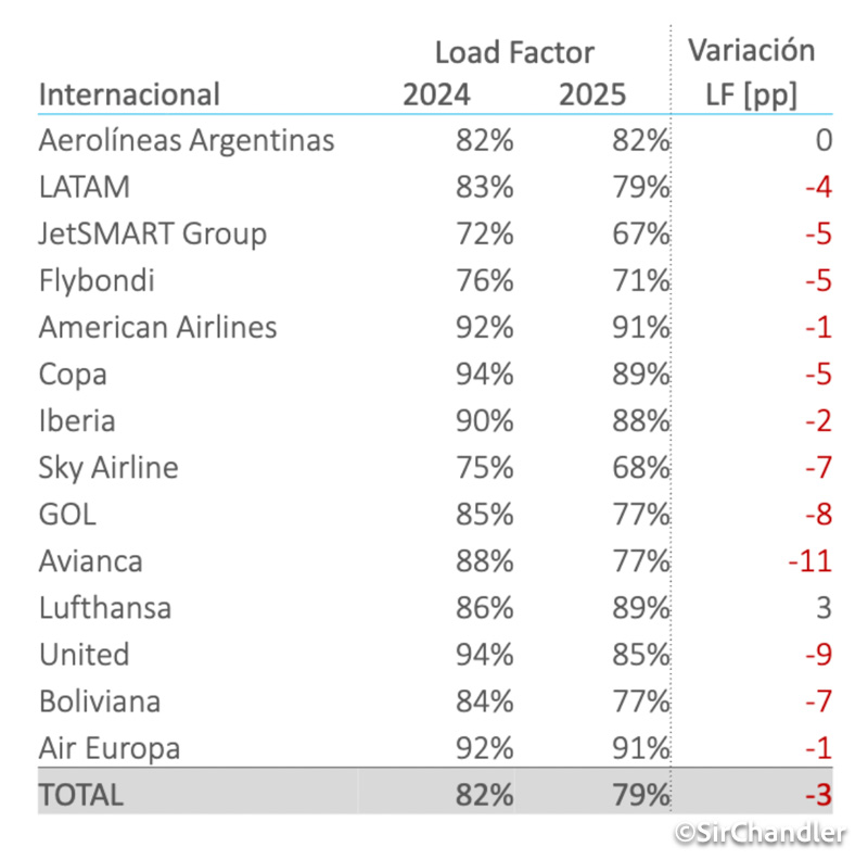 La ocupación internacional se ve que cayeron casi todas, menos Aerolíneas. Gol y Avianca de manera fuerte pero con aumento de asientos. United también pero fue a finales de mes que recién arrancó el segundo vuelo. American Airlines excelente ocupación lo que hace ver quizás necesario que el aumento de vuelos que llegó a fin de mes tendría que haber sido un poco antes. Air Europa muy bien con los cordobeses llenando el avión