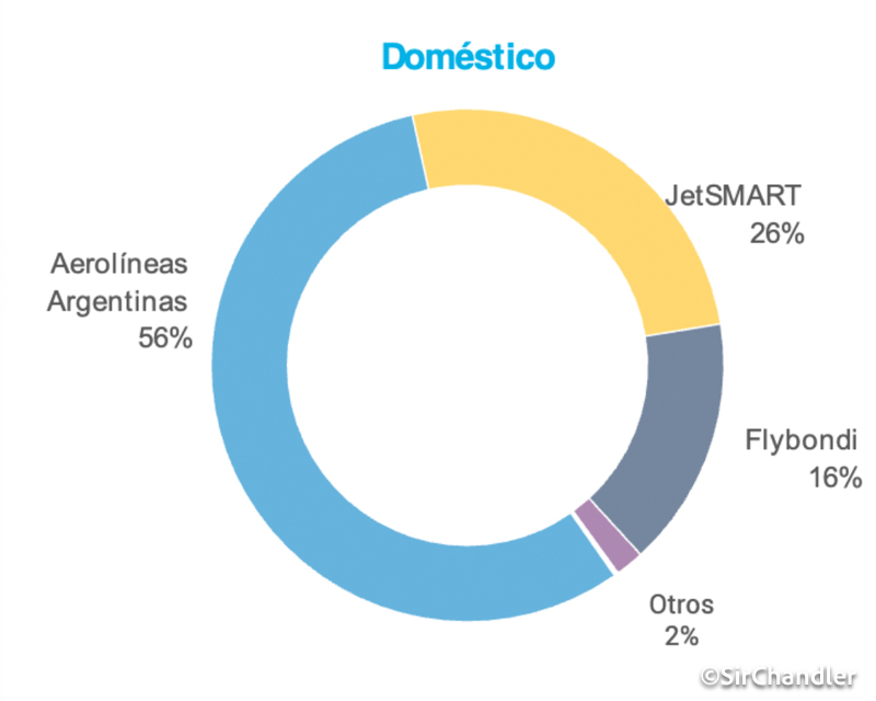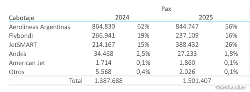 Análisis de pasajeros por cada una. Se ve como Jetsmart creció mucho en la participación con 11 puntos, siendo que 6 se los saca a AR y 3 a FB. Amén de que creció el total. AR perdió unos 20.000 pasajeros, FB casi 30.000