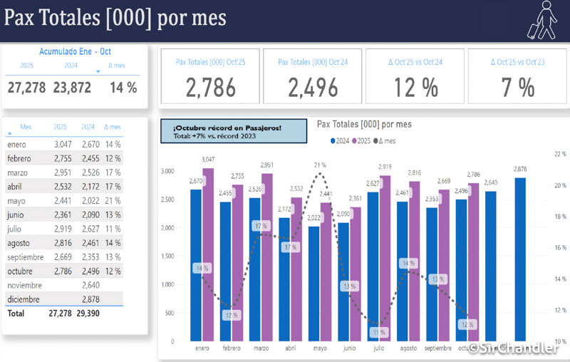 Además del incremento en la cantidad de pasajeros, la actividad operacional también mostró una expansión significativa. Los movimientos aéreos totales en octubre superaron los del mismo mes de 2024, lo que confirma el mayor
