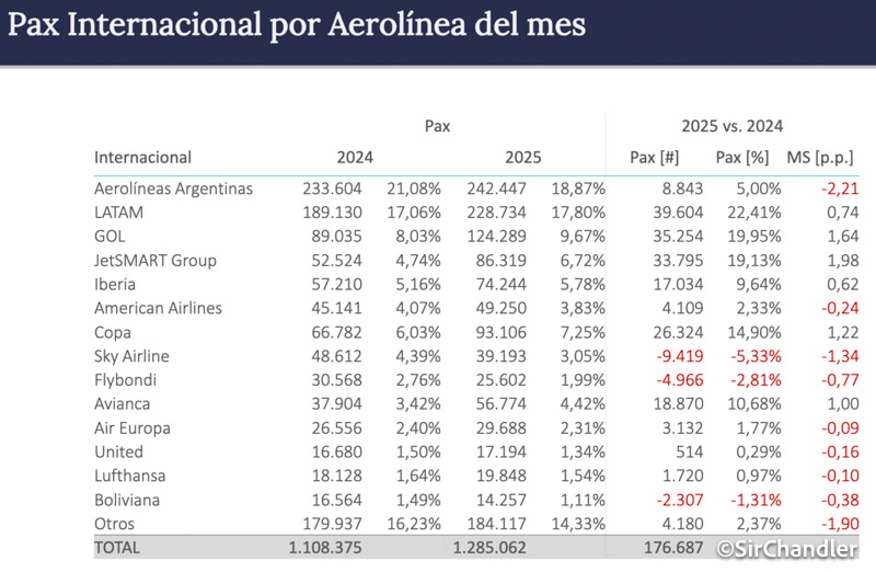 Acá se ve que Aerolíneas tuvo casi 10.000 pasajeros más, pero que LATAM creció un montón, lo mismo pasa con GOL y Jetsmart. Se ve por Iberia el nuevo vuelo. Aerolíneas perdió torta y también Sky que anda medio rara.
