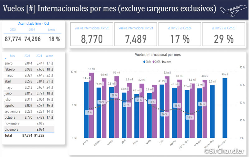 Y con este cuadro podemos ver que hay más vuelos internacionales, se creció un 17% en un año y 29% en dos