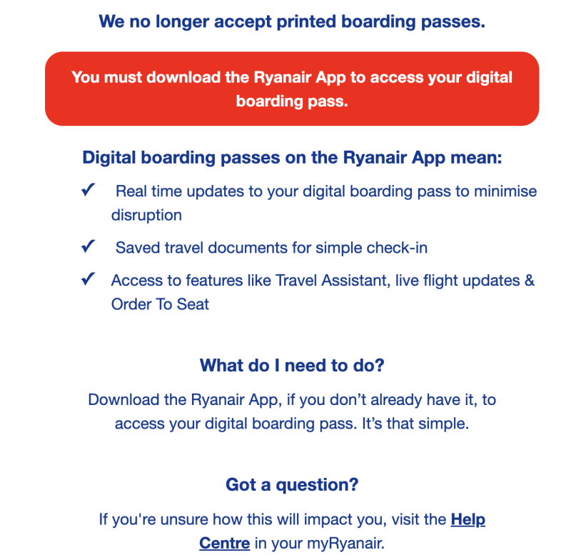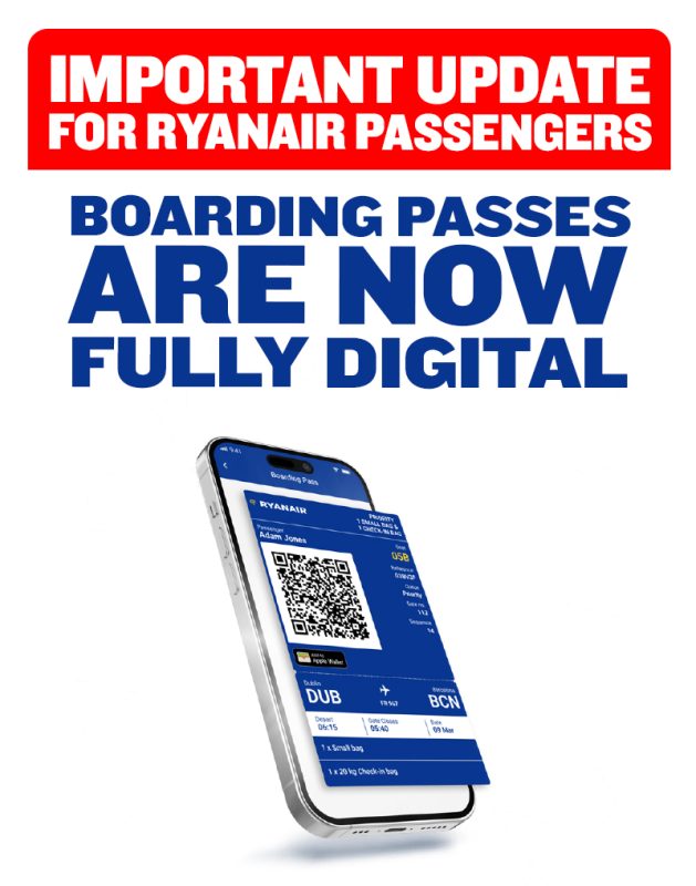 Hace algunos meses se conoció que Ryanair eliminaba totalmente el uso de los boarding o tarjetas de embarque de papel y SOLO SE PODRIA EMBARCAR CON EL CODIGO QR EN LA APLICACION DE ELLOS