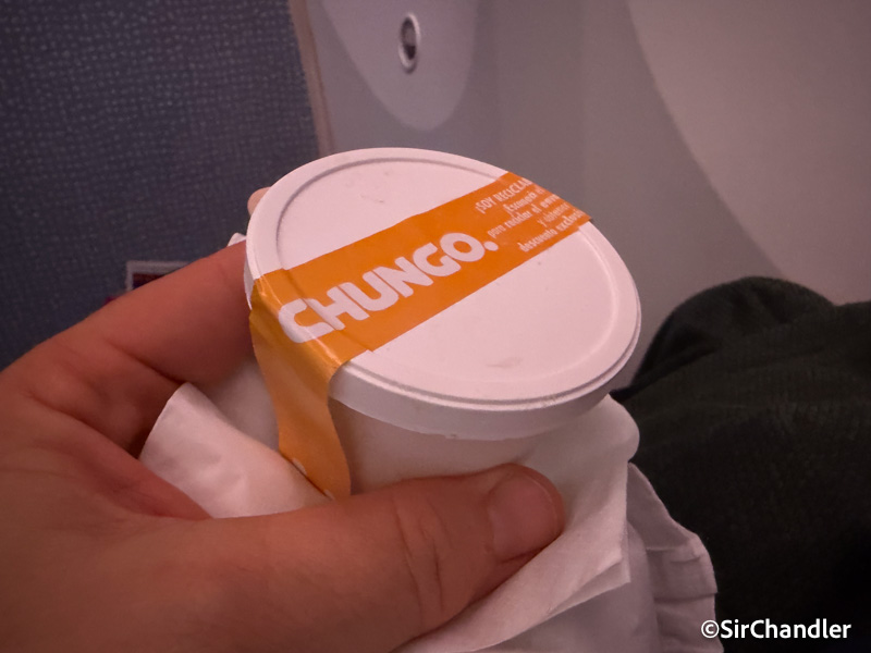 Horas después y como se ve ya sobre España, llegó el desayuno que se veía así. No había opción, pero era un plato grande con yogurt y granola. Más un corazón de frutilla. En la compotera de atrás había huevo revuelto y era la parte caliente del desayuno. El pan seguía crocante!