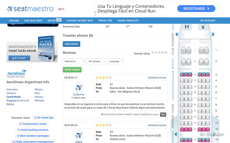 Hola Sir! Aerolopa es para mí la mejor. No tiene info casi de Aerolíneas Argentinas por ejemplo, ni clasifica asuntos con colores en mejores o peores, pero tiene en la mayoría de las aerolíneas globales mucha info y muy útil. Por ej LATAM tenés detallado fila por fila la distancia en pulgadas! Que es increíble. Vale lo mismo un asiento en un A321 en la fila 30 (28 pulgadas de espacio) que en por ej la fila 12, con 30 pulgadas de espacio. Está detallado abajo y en inglés pero no hay web similar en todo internet. Para mí, la mejor por lejos.