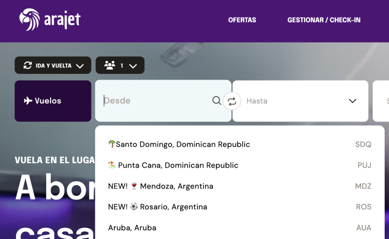 Hace unos días publiqué que Arajet volaría a Rosario por lo que pusieron en twitter. Pero varios lectores también vieron que volaría a Mendoza por lo que aparecía en su buscador. No se si por caché o por IP, pero yo no lograba ver esos dos destinos nuevos en su buscador. Tampoco la empresa envió comunicado y no me respondieron las consultas sobre los nuevos vuelos.