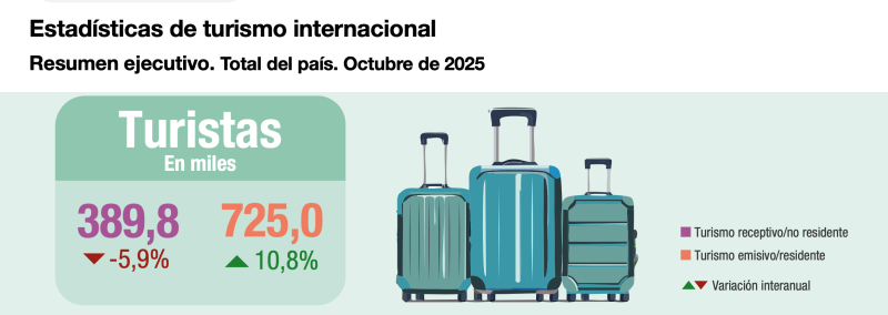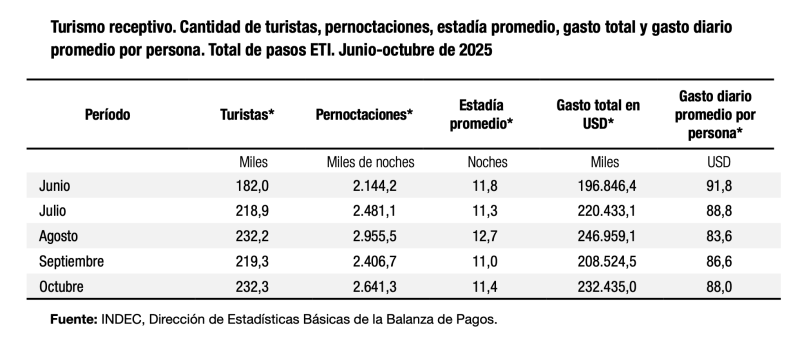En octubre de 2025, según datos del INDEC, salieron de Argentina 725.000 personas y entraron 389.800, marcando una diferencia notable. Por cada extranjero que llega, se van dos argentinos, con Chile como el caso más destacado. A pesar de una baja en los viajes hacia y desde Chile, sigue siendo el destino más elegido después de Brasil. Los turistas que más gastan en Argentina son los brasileños, seguidos por uruguayos y norteamericanos. Además, el promedio de estadía de los visitantes superó las 11 noches en los últimos cinco meses.