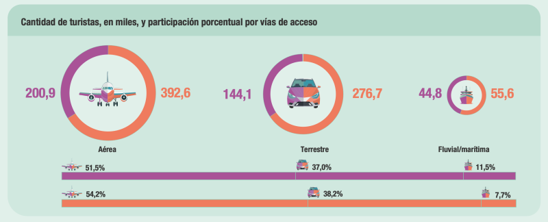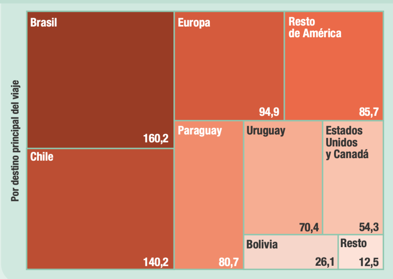 No llega a ser el triple, pero casi. Y eso que figuran un 8,4% menos que el año pasado de los argentinos yendo a Chile, donde también bajaron un 10,7% en sus arribos