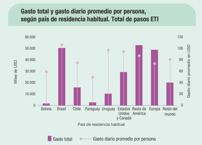 Los brasileros son los que mas gastan en promedio por día en la Argentina, con más de 100 dólares por cabeza, le siguen los uruguayos y luego los de USA y Canadá. Pero un chileno gasta más que un europeo. El paraguayo el que menos gasta