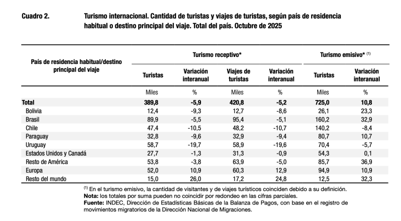El Indec publicó hace algunas semanas los números del turismo de octubre 2025 y tiene datos muy interesantes. Porque sirve para ver realmente lo que pasa, que en algunos casos dista mucho de la sensación… ejemplo, «los vuelos a USA están llenos de argentinos»… pero si ves los números es un 66% de argentinos y un 33% de estadounidenses. ¿Somos mayoría? si claro, pero no todo el avión. O sea por cada estadounidense que entra se van dos argentinos.