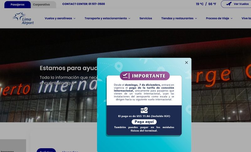 Pero se habilitó un pago online, que fue reportado por un lector. Por las dudas lo verifiqué en el sitio oficial del aeropuerto que es este https://www.lima-airport.com/