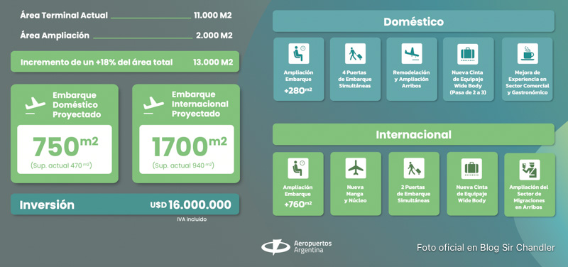 La ampliación contemplará la incorporación de 1750 nuevos metros cuadrados de terminal y 2700 metros cuadrados de superficie de remodelación, una nueva manga para reemplazar y modernizar una de las existentes, dos nuevas cintas de equipaje para arribos cabotaje -sumando un total de cuatro-, dos nuevos locales gastronómicos, nuevas áreas de espera en preembarque y nuevos sanitarios. Además, se incorporará un embarque flexible que incrementará la cantidad de asientos en las áreas de espera, ampliando la oferta de locales comerciales y gastronómicos y mejorando así, la experiencia del usuario con mejores servicios dentro del aeropuerto.