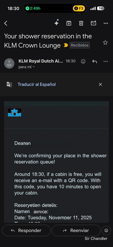 Pero para volver salí de Pekín (Beijing) y en Amsterdam cambié de avión para volver en el tradicional directo de KLM. Ese primer tramo fue en business y este segundo en turista. Pero tenía el acceso al salón por la categoría de Flying blue. Ahí aproveché a tomarme una ducha. Tienen un sistema de reserva con el mial, por turnos, que generan un QR