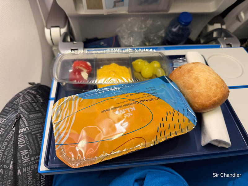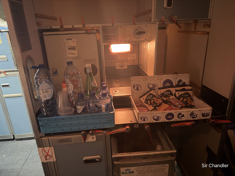 En un momento mi compañero de asiento y el del pasillo fueron al baño entonces aproveché a salir y fui a fotografiar la clásica cajita de KLM con cositas para comer… pero ya estaba bastante saqueada 😉