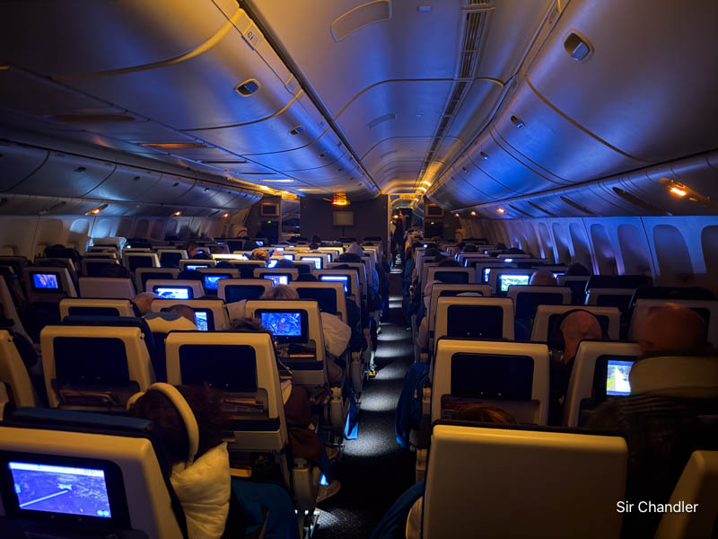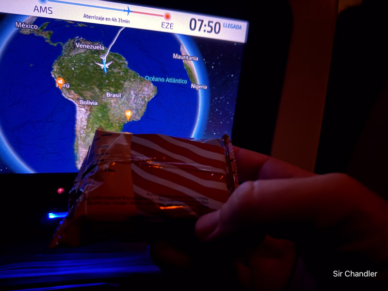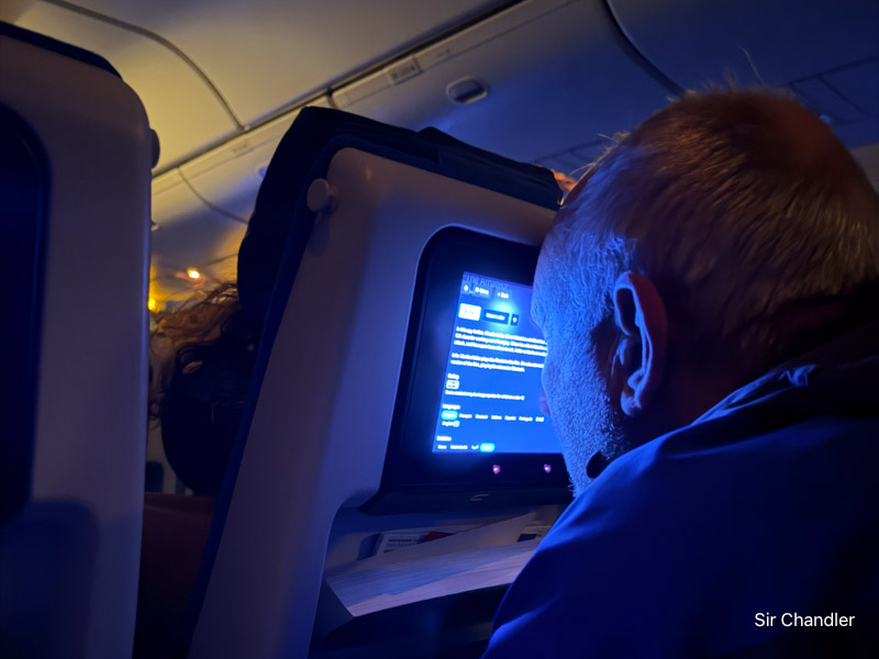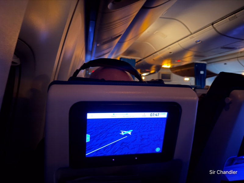 Estaba tan cansado que ME PERDI EL POSTRE, que reparten después… y me habían sacado la bandeja sin que me diera cuenta. Estaba con los horarios cambiados. Pero la consecuencia llegó unas horas después donde me desperté en el medio de la noche… y no entendía nada cuando vi a mi vecino de asiento (un sueco) pegado a la pantalla… he visto gente dormir en posiciones raras, pero así con ese brillo, nunca