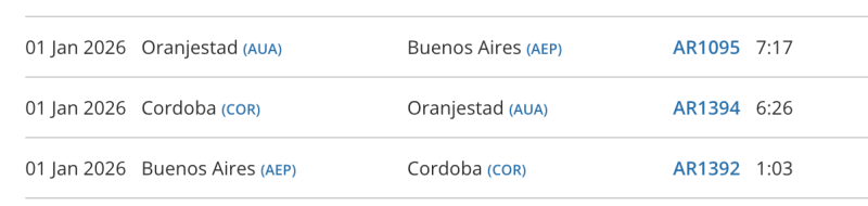 El 1 de enero Aerolíneas Argentinas comenzó a volar a Aruba por primera vez en la historia como vuelo regular. El vuelo fue el AR1394 que salió de Córdoba, aunque el avión partió desde Aeroparque como el AR1392 primero en vuelo nacional. El regreso si fue directo a Aeroparque como AR1095