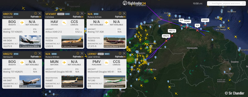 En el momento de hacer este post los aviones que están sobre Venezuela son cargueros colombianos o de aerolíneas venezolanas