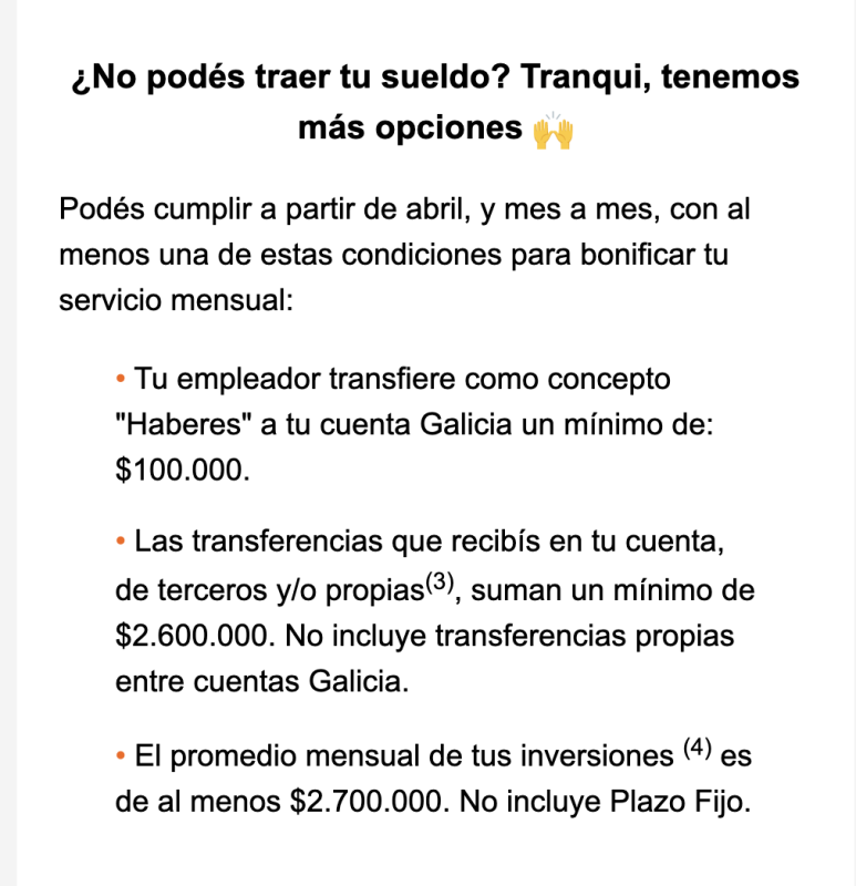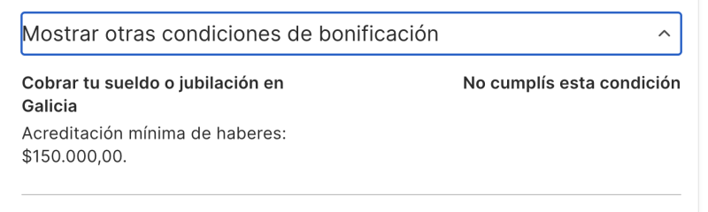 En mi caso venía bonificando transfiriendo en concepto de Haberes desde la cuenta de un tercero (mi esposa); la transferencia llegaba como «Acreditamiento de Haberes». Lo raro es que ahora veo que en Diciembre 2025 me figura que «No cumplí con esta condición», a pesar de haber recibido esos haberes. Aún no me cobraron el concepto en la Tarjeta, por lo que haré seguimiento y eventual reclamo si no bonifican…Sería una lástima ya que me ha dado buenos resultados Banco Galicia.